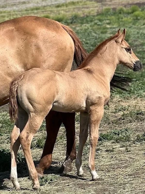 Super Classy Head Turning Filly! 2025 Red Dun+chrome, Driftwood/Doc Olena/Lucky Blanton over Quincy Dan/Smooth Town, Performance Arena/Ranch prospect for anyone competing in multiple disciplines, like heeling, tie-down, break-away, barrels, reining ect.. Snappy flat break standing start, super agile and easy to get along with, handles pressure, very confident non pushy, the Driftwood & Lucky Blanton really comes out in her demeanor. Beautiful head and all the bulk of muscle where she needs it to handle roping duties and speed events. Nothing lazy about this girl with her breeding so she'll give it when asked. Looks like she's going to come in just at 15 hands and hug 1,200lbs. Stout but feminine. Really nice prospect with Power, Beauty & Brains!